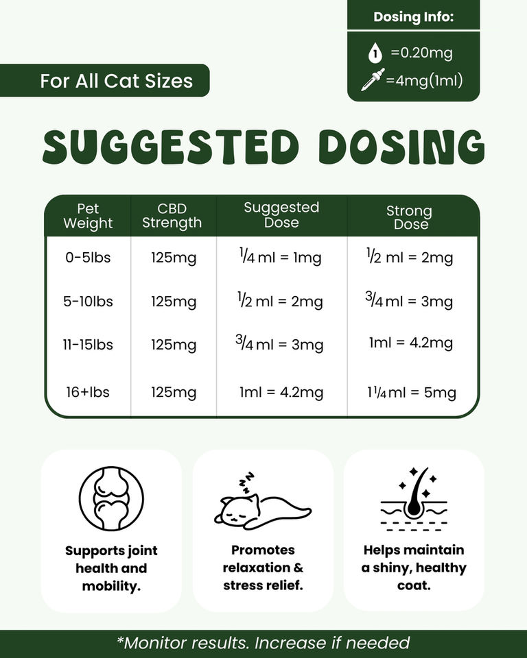 This product is not FDA-approved to diagnose, treat, cure, or prevent any disease. Dosage may vary based on the severity of symptoms. Start with a low dose and adjust as needed. Consult your veterinarian before incorporating this tincture into your cat’s treatment plan. For additional guidance, contact us to schedule a consultation with a Certified Veterinary Cannabis Counselor.